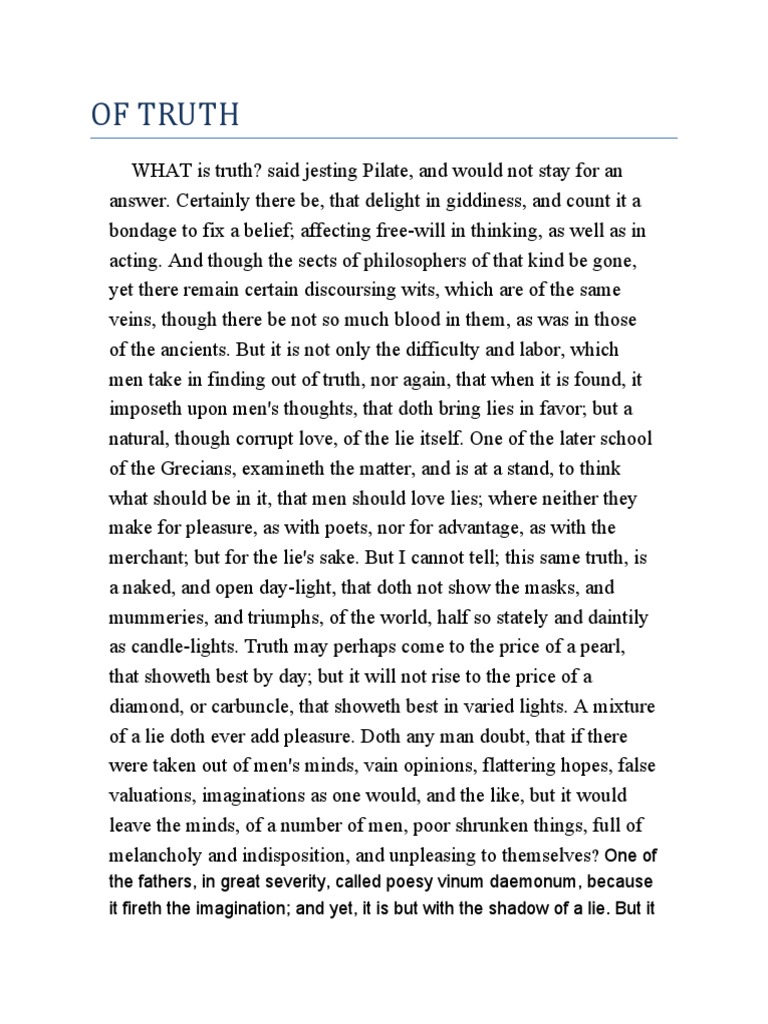 Francis Bacon. (–). Essays, Civil and Moral. The Harvard Classics. – I. Of Truth. W HAT is truth? said jesting Pilate, and would not stay for an answer. Certainly there be that delight in giddiness, and count it a bondage to fix a belief; affecting 1 free-will in thinking, as well as in acting “OF TRUTH” is Bacon’s masterpiece that shows his keen observation of human beings with special regard to truth. In the beginning of the essay, Bacon rightly observes that generally people do not care for truth as Pilate, the governor of the Roman Empire, while conducting the Apr 14, · A cocktail of lies and truth has the potency to please humans more than only lies or only truth. Bacon, paradoxically, suggests the utility of such combination of lies and truth. If everything is portrayed in their true colours with no addition of superficial praise, flaterring comments and allusions, the society will appear drab and blogger.comted Reading Time: 7 mins